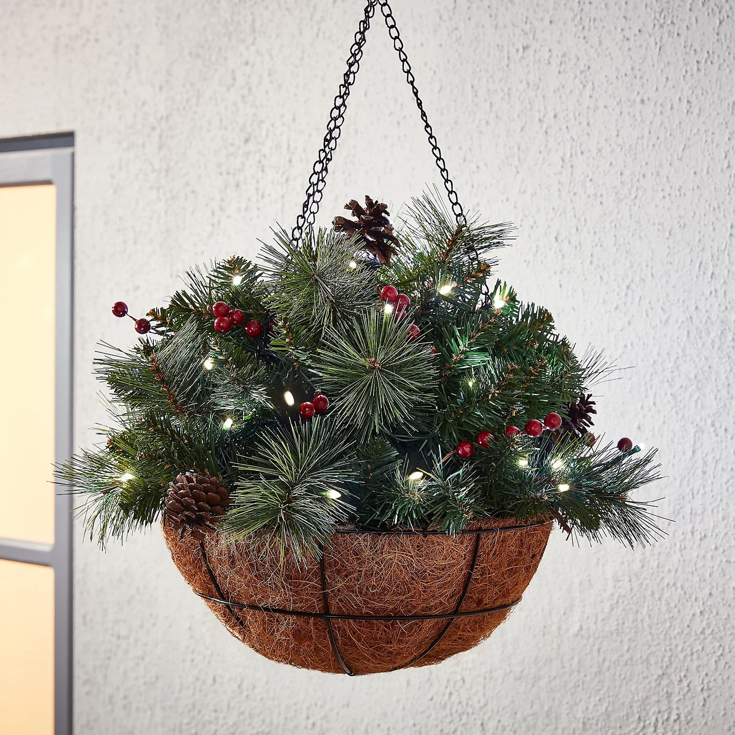 Add some instant festive cheer with out pre-lit Christmas hanging basket. Easy to maintain with faux Christmas foliage, bright red berries and pine-cones, we’ve pre-lit this hanging basket with 35 battery operated warm white lights for a bright and fresh natural look.